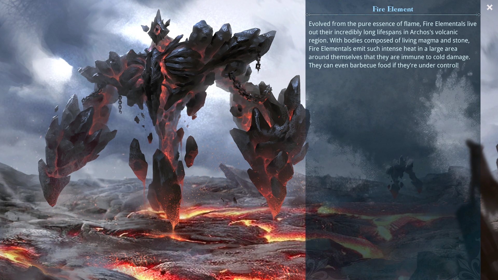 In-game description: Evolved from the pure essence of flame, Fire Elementals live out their incredibly long lifespans in the volcanic region of Archos. With bodies composed of living magma and stone, Fire Elementals emit such intense heat in a large area around themselves that they are immune to cold damage. They can even barbecue food if they're under control!